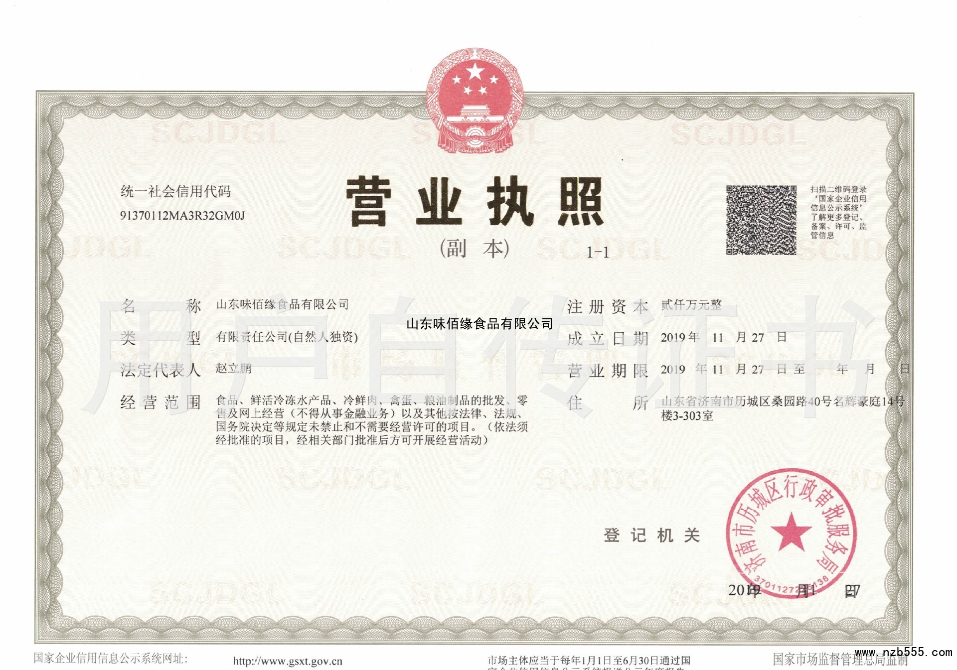 食品、鮮活冷凍水產品、冷鮮肉、禽蛋、糧油制品的批發、零售及網上經營(不得從事...