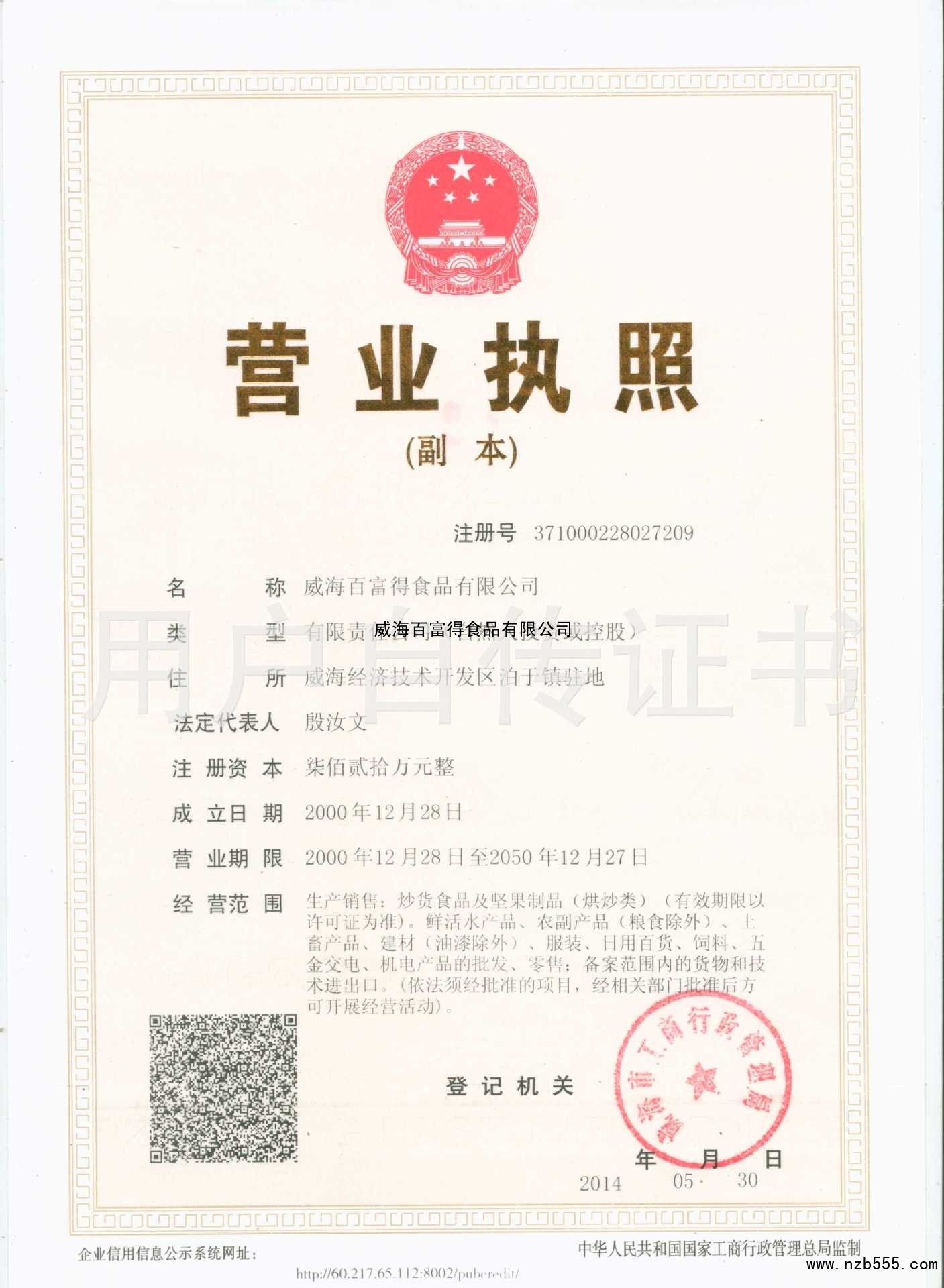 | 發(fā)證機(jī)構(gòu): | 威海市工商行政管理局 | 發(fā)證時(shí)間 : | 2014-05-30 |