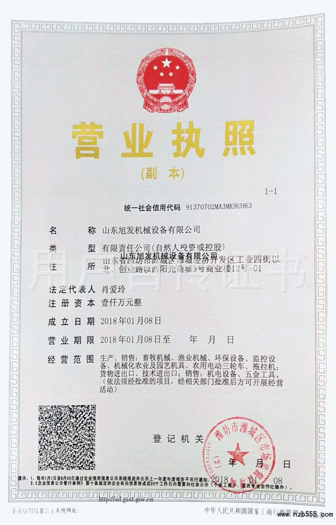| 發(fā)證機(jī)構(gòu): | 濰坊市濰城區(qū)市場監(jiān)督管理局 | 發(fā)證時間 : | 2018-01-08 |