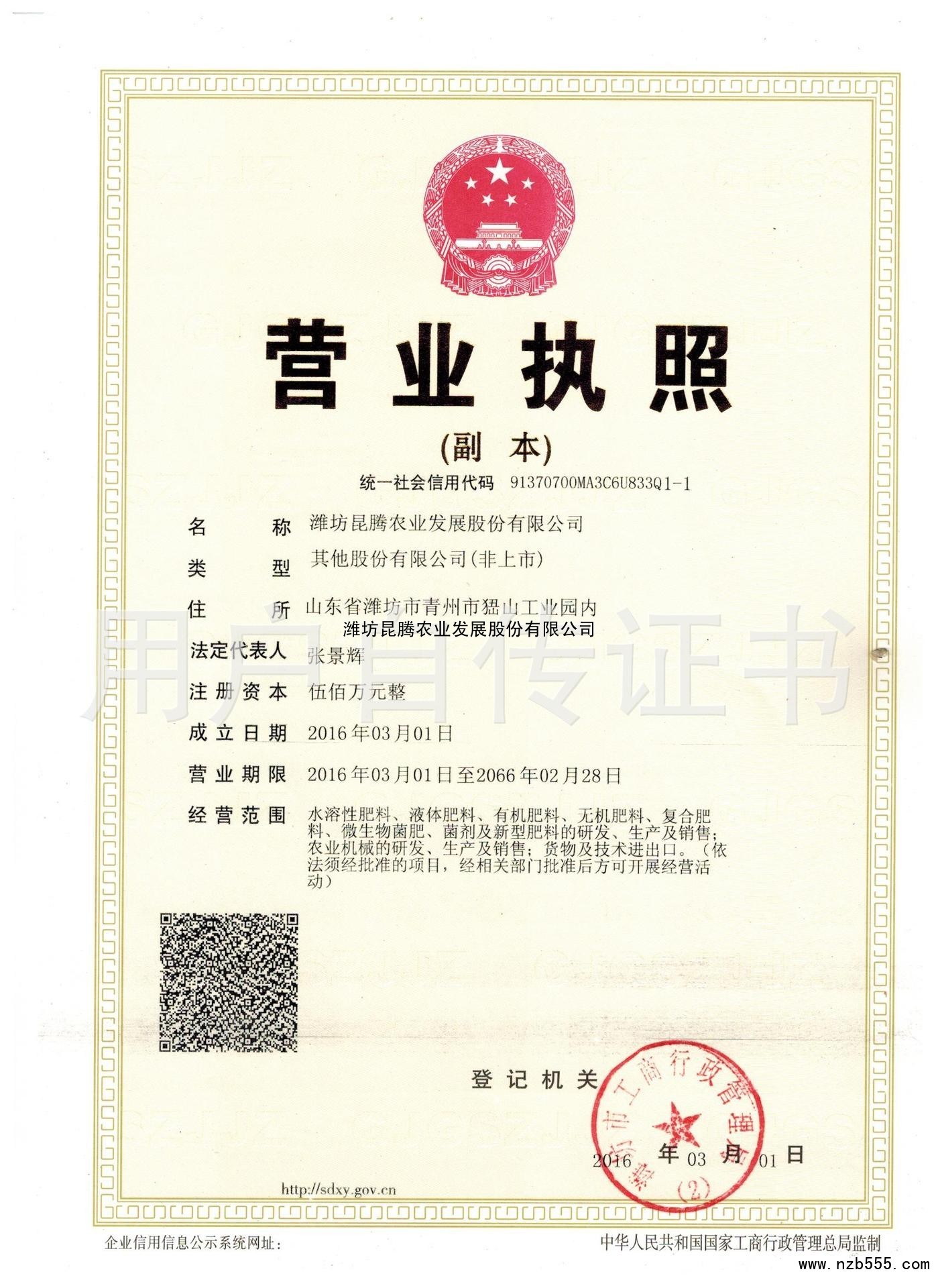 | 發(fā)證機(jī)構(gòu): | 濰坊市工商行政管理局 | 發(fā)證時間 : | 2016-03-01 |