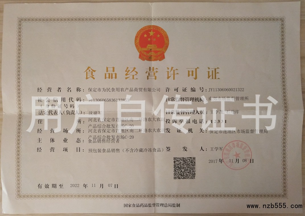 | 發(fā)證機(jī)構(gòu): | 保定市蓮池區(qū)市場監(jiān)督管理局 | 發(fā)證時間 : | 2017-11-08 |