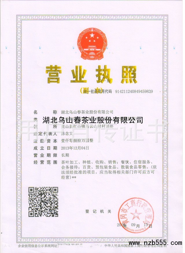 | 發(fā)證機(jī)構(gòu): | 黃岡市工商行政管理局 | 發(fā)證時(shí)間 : | 2016-09-13 |