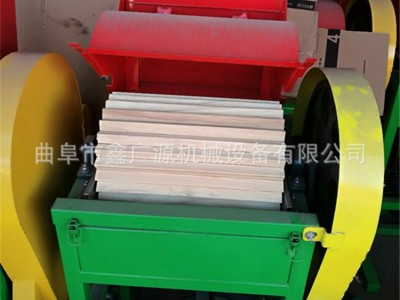 花生果由人工喂料,先落到粗文柵里,由于文板轉動與固定柵條凹板間的搓力,將花生殼剝離分離后的花生仁與殼同時經過柵網落下,再通過風道過由風力將大部分花生殼吹擊機外,而花生仁和一部分尚未剝離的花生小果一起落入比重分選篩,經過重篩選后,花生仁由分離篩面上行,通過料口流入麻袋,而尚未剝離的花生(小果),則由篩面下行,經過出料道口流入提升機,再由提升機送入細紋柵進行二次剝殼,再經過比重分行篩分選,即可達到全部剝離。