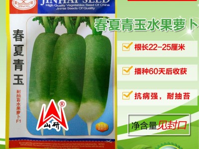 利用韓國材料雜交選育的春、夏季種植的水果型青蘿卜品種,播種后60天收獲,植株生長健壯,綜合抗病性強(qiáng),耐抽苔,耐熱性強(qiáng)。葉色深綠,羽花狀,肉質(zhì)根長圓柱型,根長22-25厘米,橫徑7厘米左右;外皮光滑,綠色有光澤,皮薄肉脆綠,汁多脆甜,生熟食用皆佳。及時(shí)收獲不易糠心,產(chǎn)量高,商品性優(yōu)。是春、夏、秋季栽培獲得較高經(jīng)濟(jì)效益的佳品種。