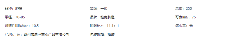 贛南臍橙果大形正,一般每個250克,橙紅鮮艷,光潔美觀,可食率達(dá)85%,顏色偏紅,比其他產(chǎn)地的橙子顏色略深;果皮光滑、細(xì)膩;果形以橢圓形多見。