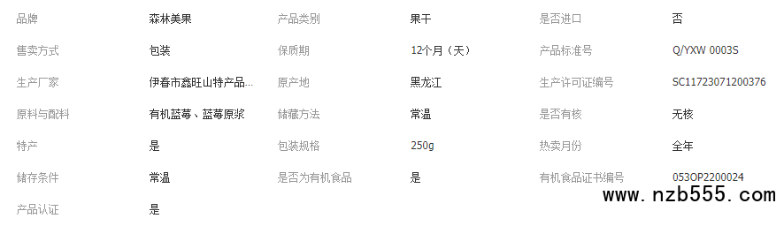 九鑫山珍森林美果有機(jī)藍(lán)莓果干250g無油減糖不臟手有嚼勁不齁膩
